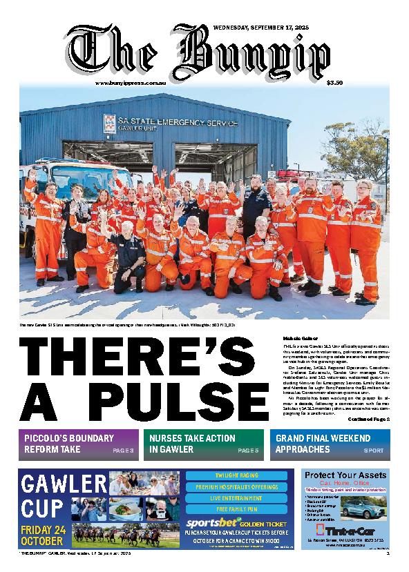 The Bunyip – 17th September 2025 Subscribe or Login to see the rest of the content. Username Password * Remember Me Forgot Password News Council calls for early infrastructure for Concordia 05/12/2025 TOWN of Gawler is standing united in its push to ensure the Gawler River is protected and essential infrastructure is delivered early in the... Villawood Gawler Christmas Parade socials 05/12/2025 Pullicino brings up 1000th career win at 70 years old 05/12/2025 TWO Wells trainer Ryan Hryhorec continued his superb run of form with four victors on Saturday, giving him nine winners from the last 20...