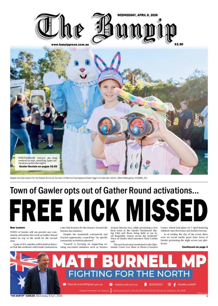 The Bunyip – 8th April 2026 Subscribe or Login to see the rest of the content. Username Password * Remember Me Forgot Password News Gathering around again? 18/04/2026 WHERE Gawler failed to capitalise on all that Gather Round has to offer, the Barossa ensured it would not miss out. That was naturally... Letters to the Editor 18/04/2026 Just ToG being ToG Last week’s Bunyip ran a front page and page 3 article, plus editorial, all exposing, and highly critical of, Gawler Council’s... Drink driver more than five times legal limit at Two Wells 18/04/2026 A 56-year-old Campbelltown woman was detected at more than five times the legal limit at Two Wells last week. Police detected the 4WD speeding...