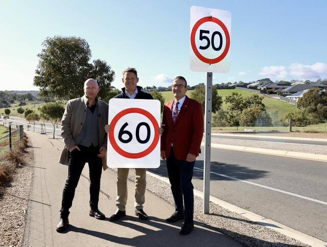 Town of Gawler chief executive Chris Cowley (left), Labor candidate for Light James Agness and Member for Light Tony Piccolo changed the signs for Schomburgk Drive speed limit increase to 60km/h. (Supplied)