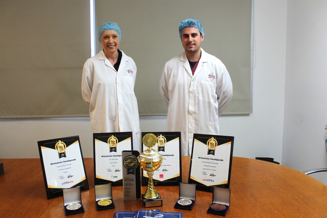 Wintulichs operations manager Emma Robertson (left) and productions manager Daniel Korber with various awards won by the business. (Mahala Gainer 495221_03)