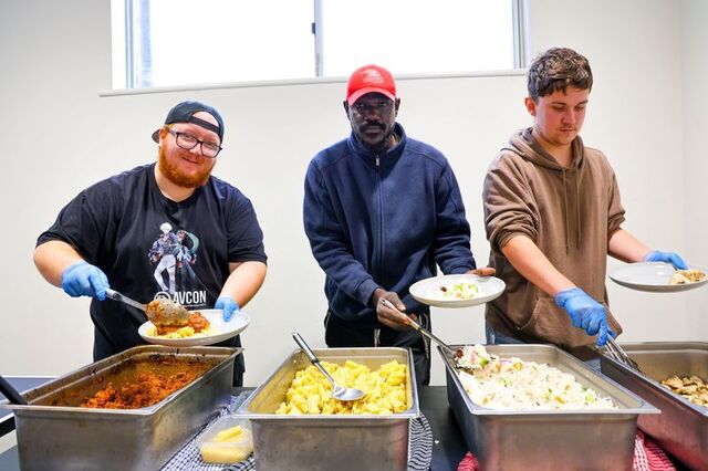 Program participants Nick Tichborne, Emmanuel Taban and James Williams serving food to Adelaide United players. (Supplied)