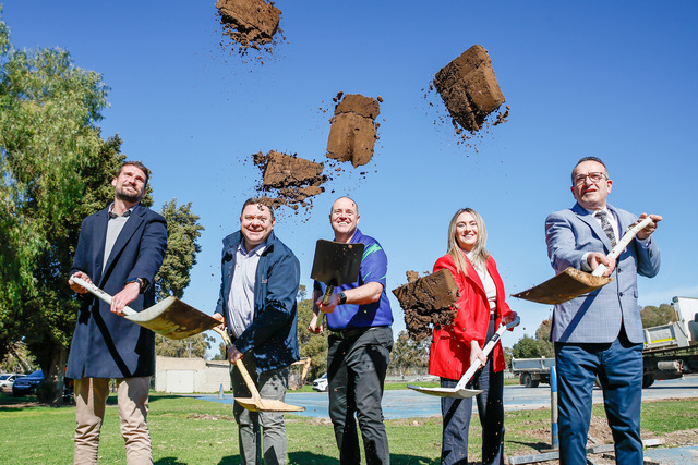 Town of Gawler Acting Mayor Nathan Shanks, Member for Spence Matt Burnell, Gawler and District Tennis Association president Damian McGee, Minister for Junior Sport Participation Rhiannon Pearce and Member for Light Tony Piccolo get creative at the sod turning for the new Gawler tennis facilities. (Mark Willoughby: 497062_03)