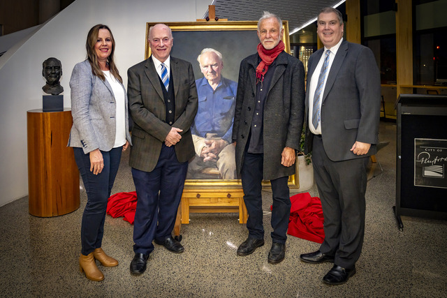 Hugh Stretton’s children Sally Dridan and Simon Stretton, artist Robert Hannaford and City of Playford Mayor Glenn Docherty pictured with the Archibald prize-winning portrait of Hugh Stretton which was unveiled at the Stretton Centre’s 10th birthday celebration. (Supplied)