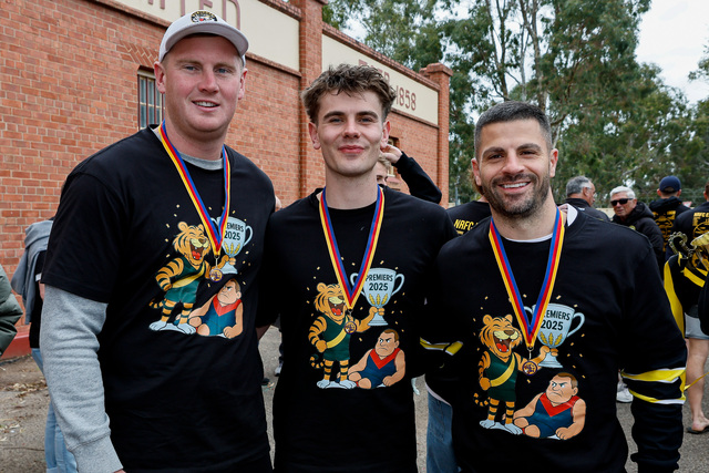 Shane Dearlove, Kai Rosenzweig and Tim Dimasi at the BLG chimney celebrations after Nuriootpa's premiership win. (Mark Willoughby: 506907_02)
