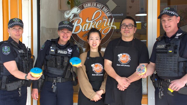 Senior Constable Sandra Mackie, Sergeant Debbie Luetkens and Sergeant Greg St Clair with Gawler Hot Bread Bakery’s Ella and Ryan Nguyen celebrating Blue Donut Week. (Imogen Evans: 506636_01)