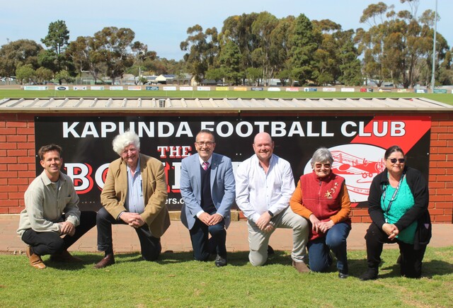 Member for Mandurah Rhys Williams, conference organiser Peter Kenyon, Member for Light Tony Piccolo, Kapunda Mural Town Committee members Danny Menzel and Maxine Donald and Wasleys Community Group chairperson Jenny Polley at the National Small Town Reinvention Conference in Kapunda last month. (Mahala Gainer 507178_01)