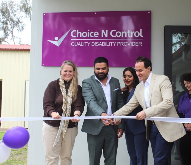 Member for Frome Penny Pratt, founders of Choice N Control Sanamdeep (Sunny) Singh and Rajiwinder (Raji) Mann and Opposition Leader Vincent Tarzia open stage one of the Choice N Control facility upgrade. (Mahala Gainer 508751_01)