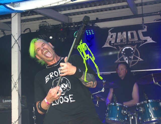 A Murder of Crows frontman Paul13 shredding a microphone stand during Saturday's Metal on Murray XL at the Prince Albert Hotel. (Imogen Evans: 513424_02)
