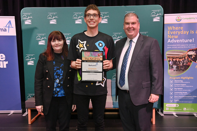Personal Development Award winner Joshua Antonello with award sponsor Barkuma representative Maureen Lawlor and City of Playford Mayor Glenn Docherty at the International Day of People with Disability Mayoral Awards recently. (Supplied)