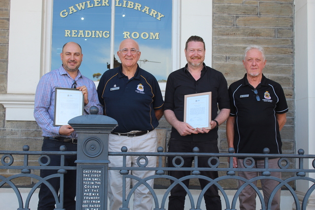 Town of Gawler staff members Michael Bombardieri (left) and Tim Oppermann (centre right) were awarded with certificates of appreciation from Gawler RSL president Colin Wardrop (centre left) and vice president Chris Cornall. (Mahala Gainer: 524142_02)