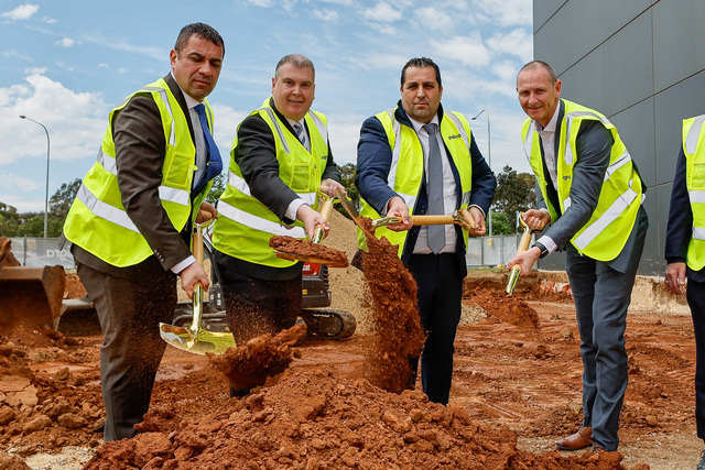 Pelligra Group chairman Ross Pelligra, City of Playford Mayor Glenn Docherty, Paul Pelligra and City of Playford chief executive Sam Green help get construction of the Playford Commercial Hub under way. (Mark Willoughby: 511832_01)