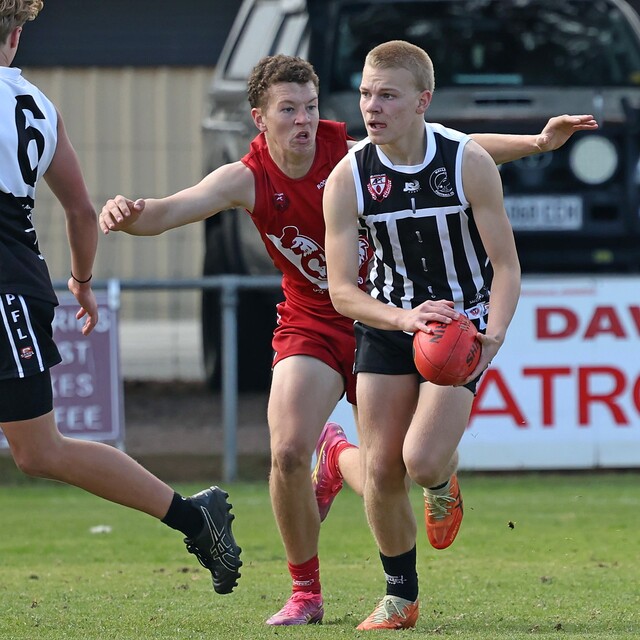 Michael Daly sneaks up on Mallala's Khyan Carpenter as he looks for an option. (Michael Slattery: 491108_06)