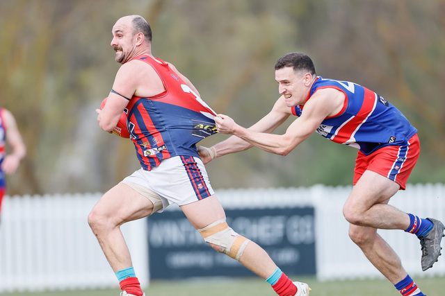 Joshua Waldhuter tries to power away as Damien Nangle clings to his jumper. (Mark Willoughby: 495309_07)
