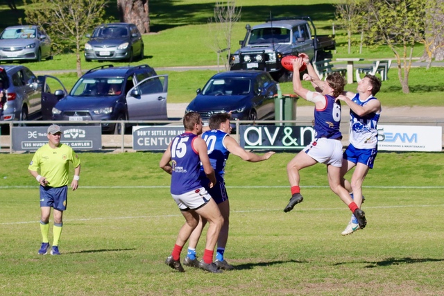 Austin Poulton cops a whack across the face as he leads out of the goalsquare on his way to four majors. (Supplied: Jason Malkin/Freeling Football Club)