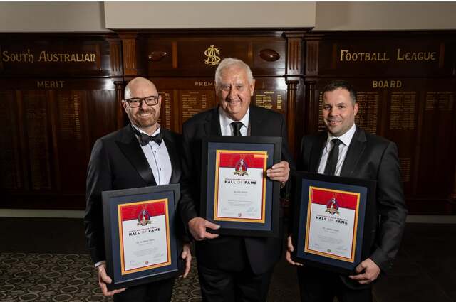 Central District great Kris Grant (middle) flanked by fellow SA Football Hall of Fame inductees Andrew Payze and James Allan. (Supplied: SANFL/James Elsby)