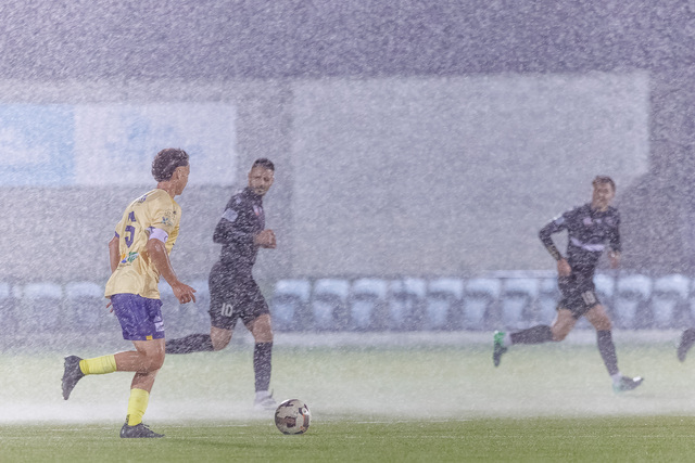 Brett Verdon trudges through midfield as rain and hail pour down. (Mark Willoughby: 500456_02)