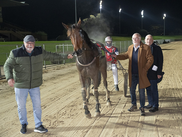 Connections of Cadence Lane celebrate their win at Globe Derby Park on Saturday, which was one of five winners on the card trained by Ryan Hryhorec. (Supplied: Arclight Photography)