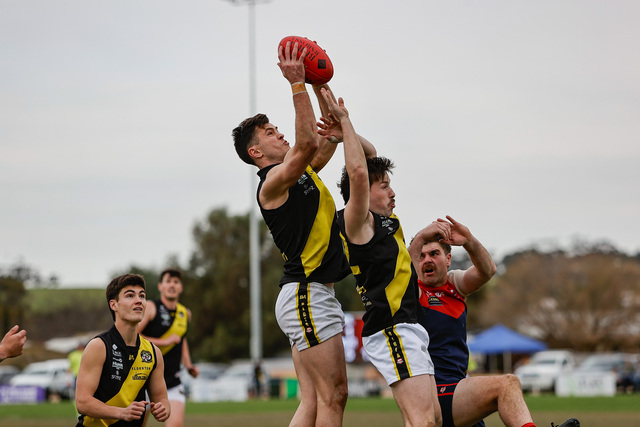 Reigning Schluter Medallist Nicholas Gregurke takes one of his numerous contested marks in a best-on-ground masterclass against Willaston. (Mark Willoughby: 501927_01)