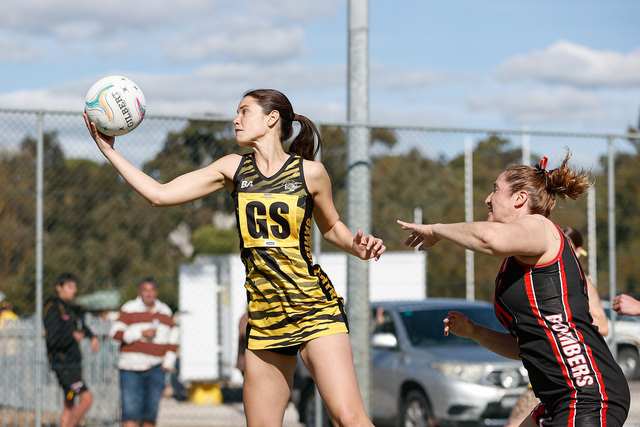 Gawler Central's star goal shooter Dayna Schmid gets separation from her direct opponent Rebecca Sims. (Mark Willoughby: 503582_01)