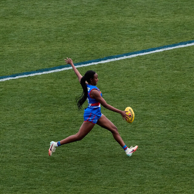 Elaine Grigg with one of her career-high 13 disposals for the Western Bulldogs on the weekend. (Supplied: Instagram/Western Bulldogs AFLW/@ByTheWhiteLine)