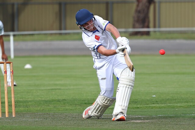 Riley Nottle winds up and slogs over the on-side on his way to top-scoring for South Gawler's under 16s with 57 from 47 balls. (Michael Slattery: 513071_02)