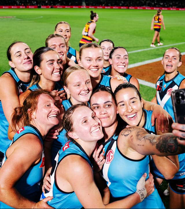 Jasmine Evans in the middle of Port Adelaide's team selfie after winning the club's first AFLW Showdown. (Supplied: Instagram/Port Adelaide Football Club)