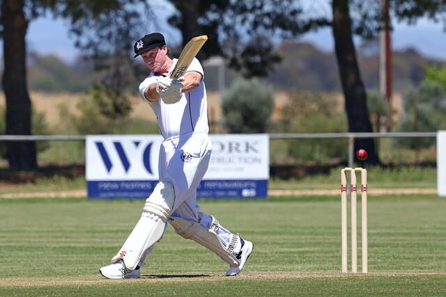 Mallala's Jake Birchmore takes a big swing and inside-edges one down the leg-side. (514797_01)