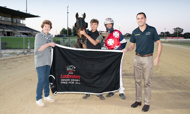 Connections of Lord Zarias celebrate their success in the Minor Derby Free For All. (Supplied: Arclight Photography)